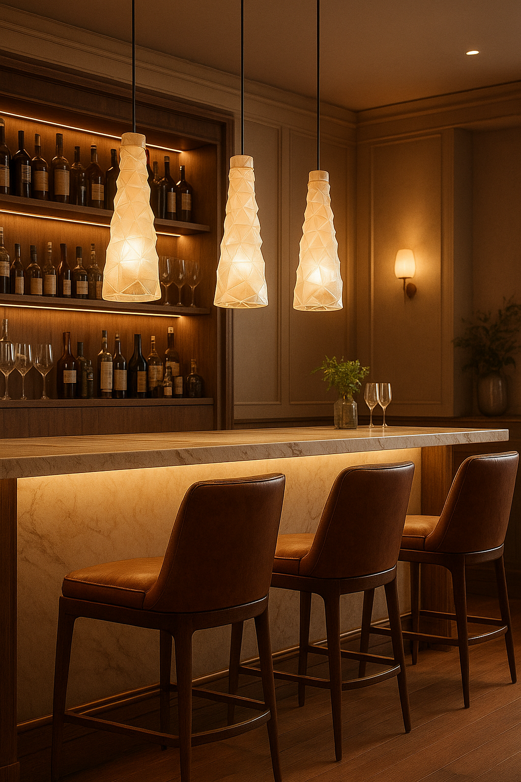 Подвесной светильник из полиэтиленового войлока, способного поглощать звуковые волны, уменьшая эхо и помогая создавать комфортное звуковое окружение в помещении. Высота светильника может регулироваться.