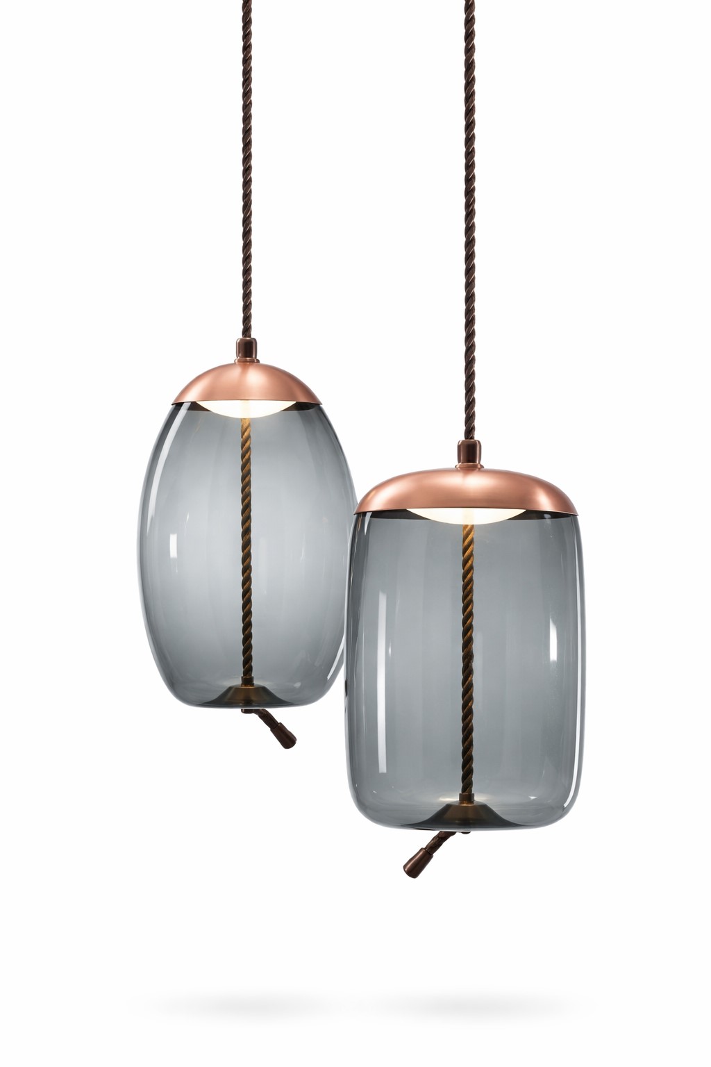 Стеклянная колба серого цвета, пронизанная толстой веревкой, завязанной узлом. На верхушке колбы колпак из никеля, в который встроена светодиодная панель.