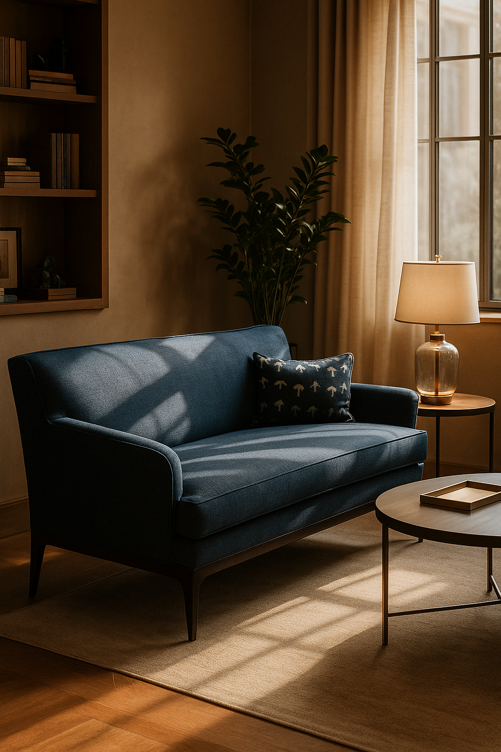 Стильный малогабаритный диван на легких деревянных ножках. Обит синей тканью с выраженной фактурой, достоинства которой в высокой плотности и прочности, и несомненно, в привлекательности внешнего вида.
