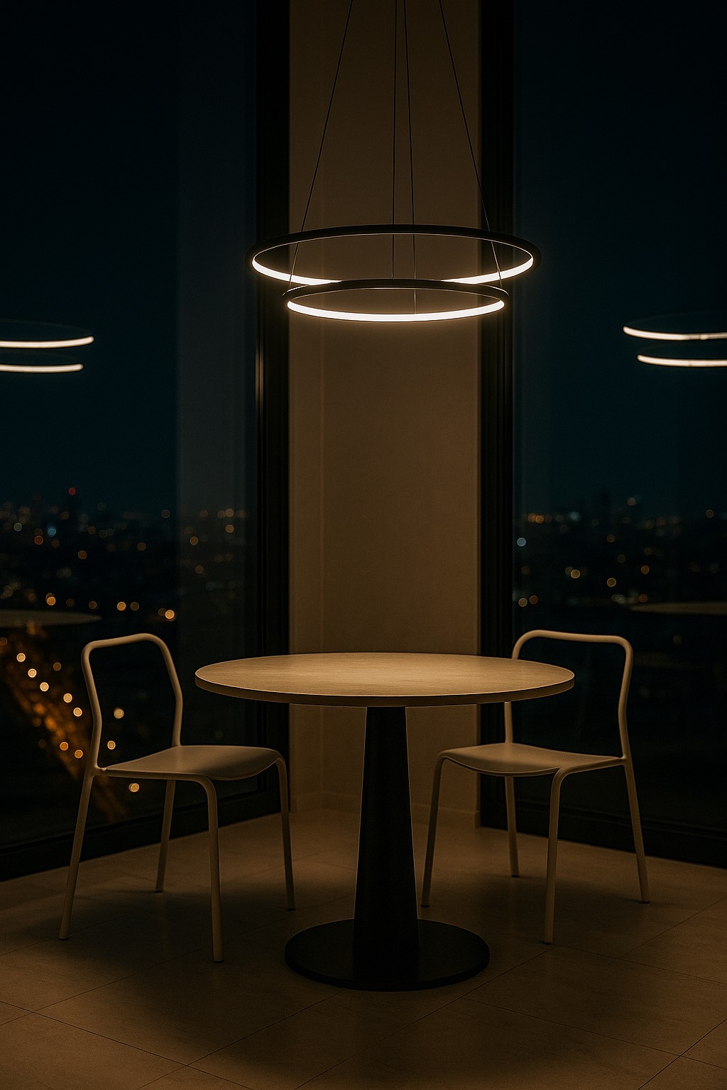 Тонкий контурный подвес тольщиной всего 15 мм. Внутри установлена диодная линейка, засвечивающая светильник равномерно по всему диаметру. Рассеиватель из силикона обеспечивает мягкое свечение. Тросы подвеса регулируются независимо друг от друга, что позволяет создать интересные графические эффекты, установив контуры под углом (с помощью разной длины троса в узлах креплений). В серии представлены одиночные, двойные и тройные круги различного диаметра. Корпус изготовлен низ алюминия, окрашен в белый или черный цвет. Источник питания в комплекте.