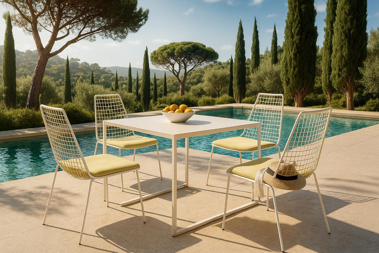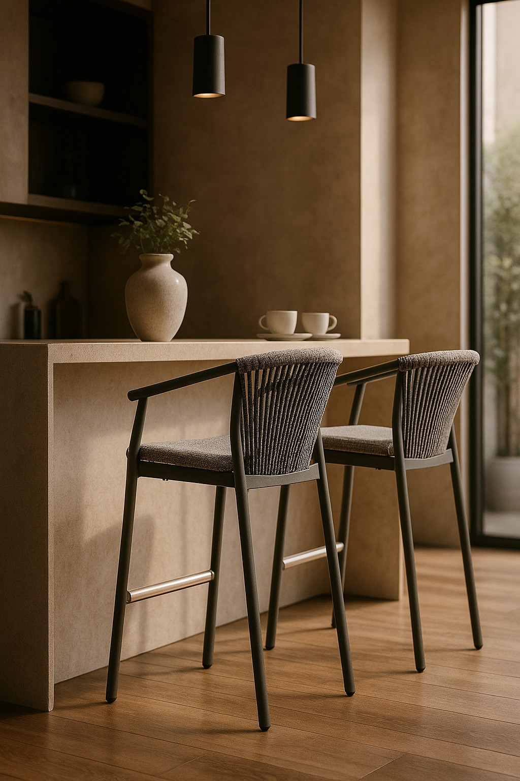 Полубарный стул, плетенный из синтетического шнура. Алюминиевый каркас с порошковым покрытием. Сидение обтянуто технической тканью VAR#TEX. Спинка украшена синтетическим шнуром VAR#TEX. Представлен в сером цвете. Все материалы прекрасно отводят влагу, что делает изделие подходящим для использования на открытом воздухе.